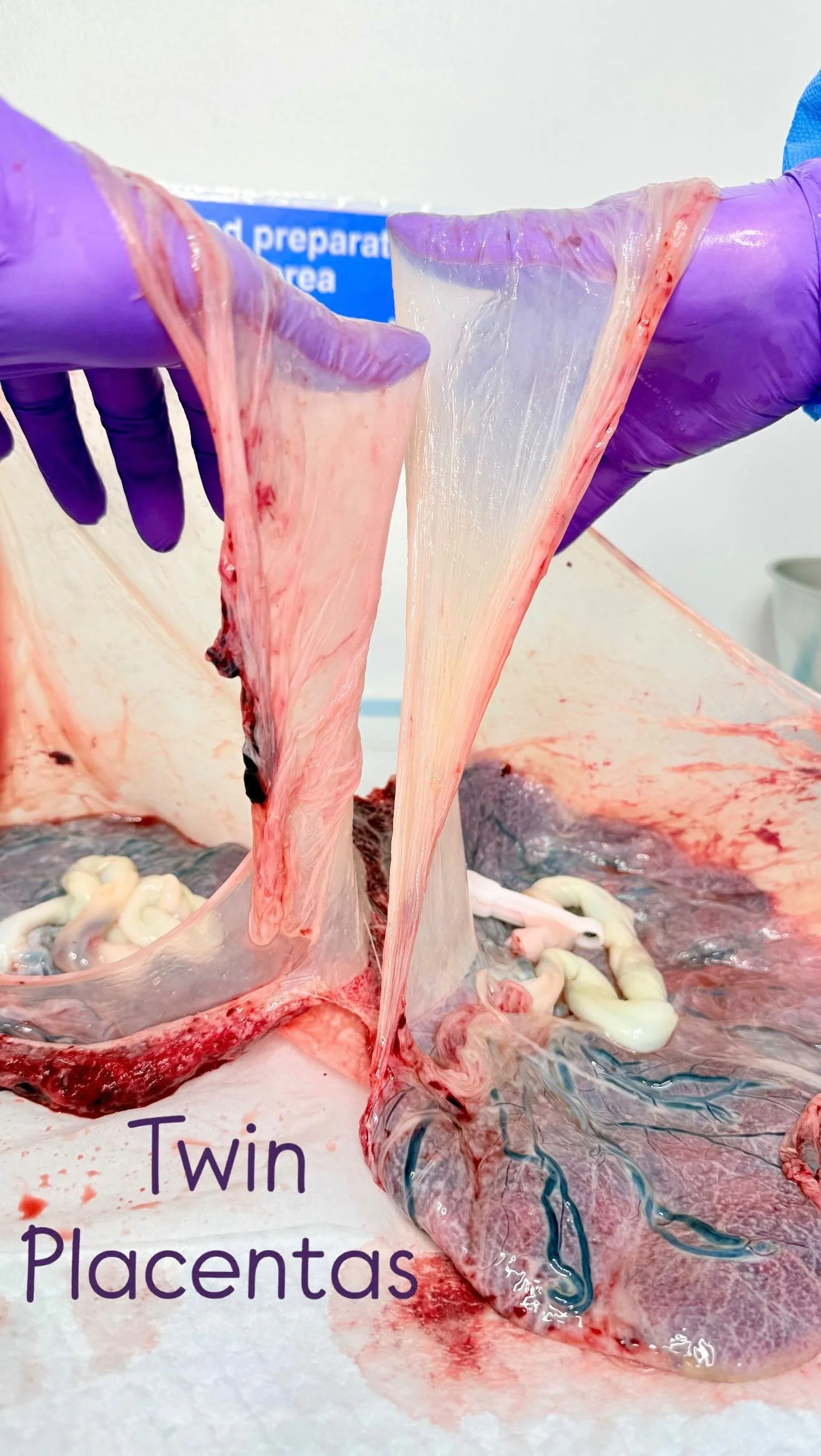 Clean lab with white cabinets and countertops, stainless steel sinks, a small appliance, a wall-mounted soap dispenser, and fluorescent lighting where placentas are processed.